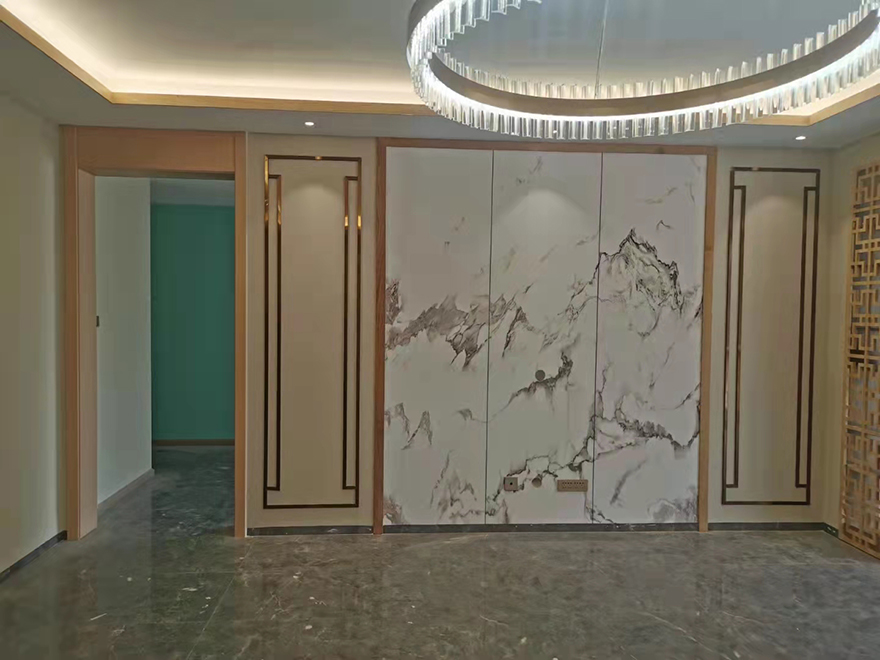 電視背景與沙發(fā)背景局部的木元素和黃銅浮雕構(gòu)件,使整體空間感覺(jué)更加豐富,大而不空、厚而不重,有格調(diào)又不顯壓抑。